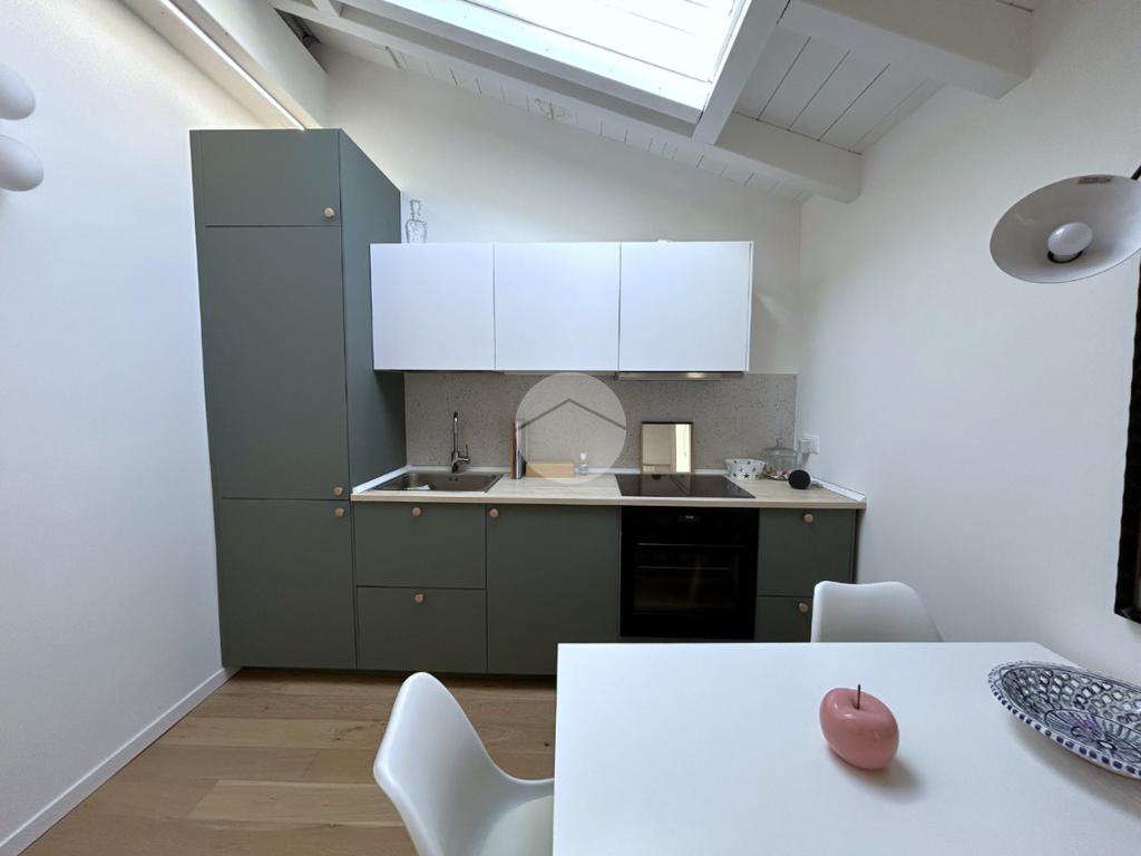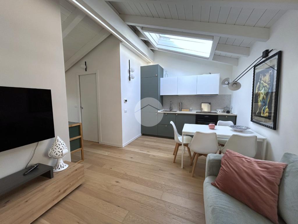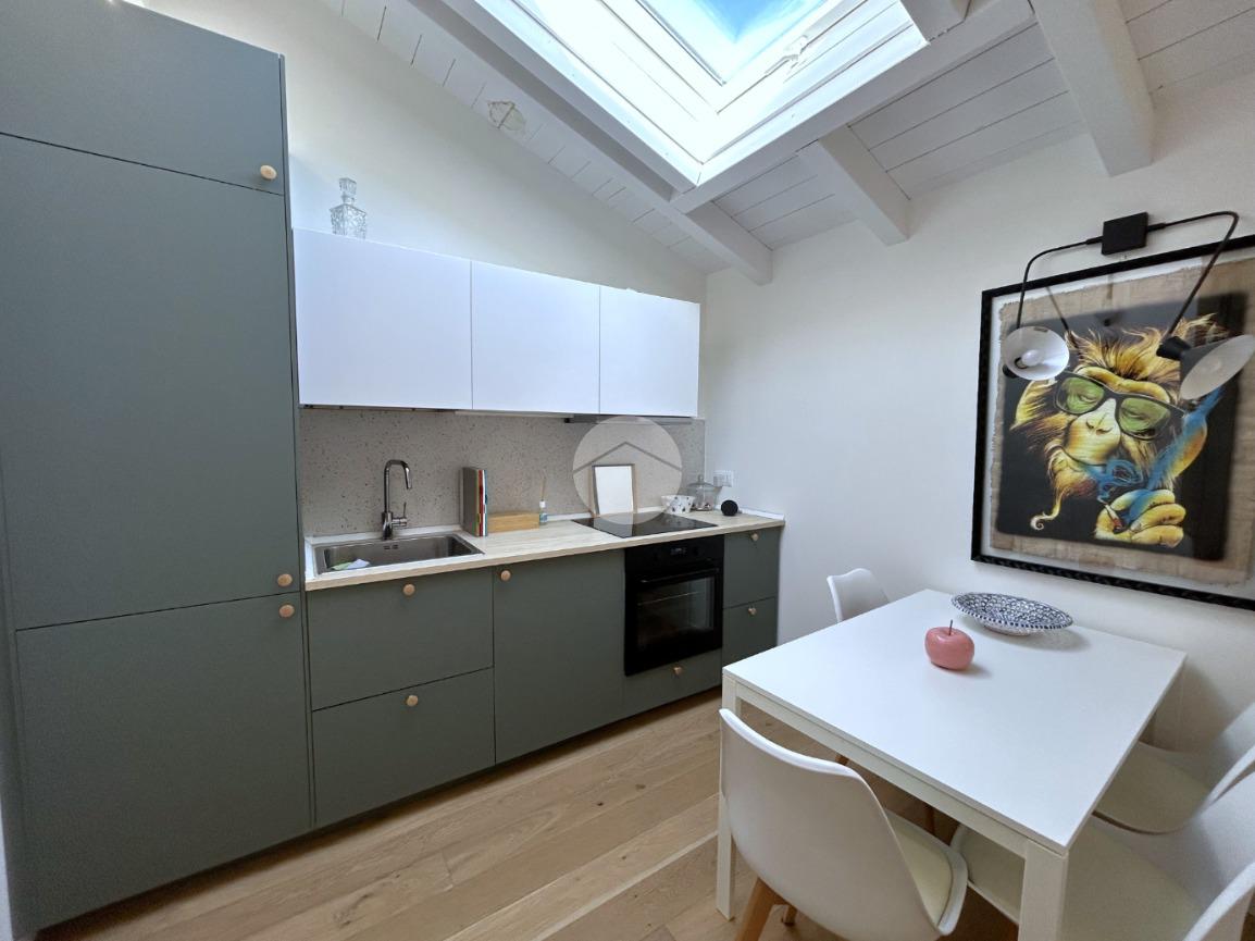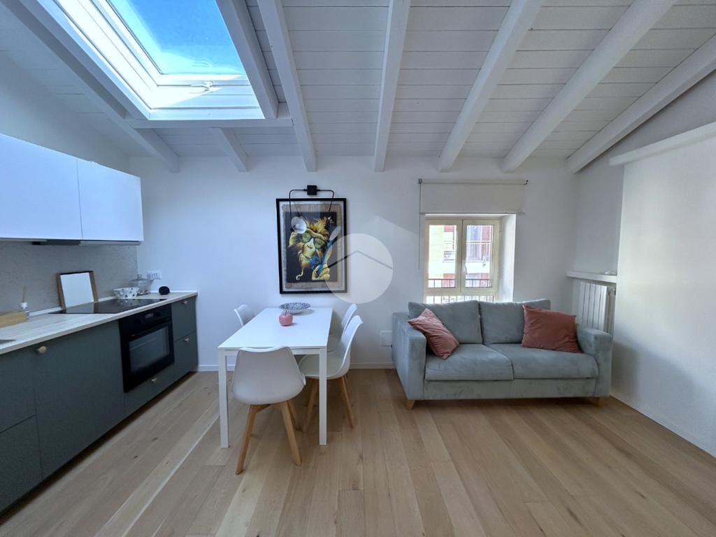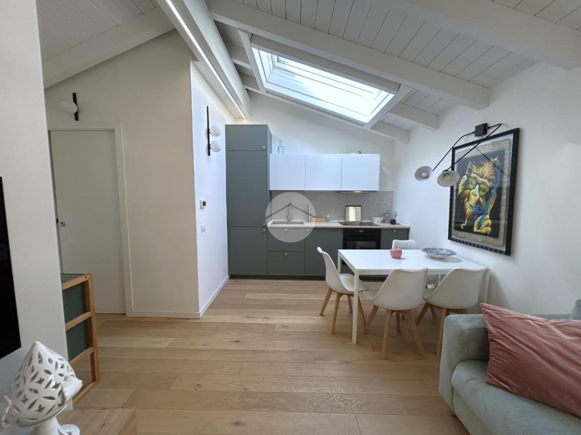L’ingresso in corridoio, introduce a un ampio e luminoso living con cucina a vista, valorizzato dalla presenza di finestra e velux, che assicurano un’ottima illuminazione naturale.